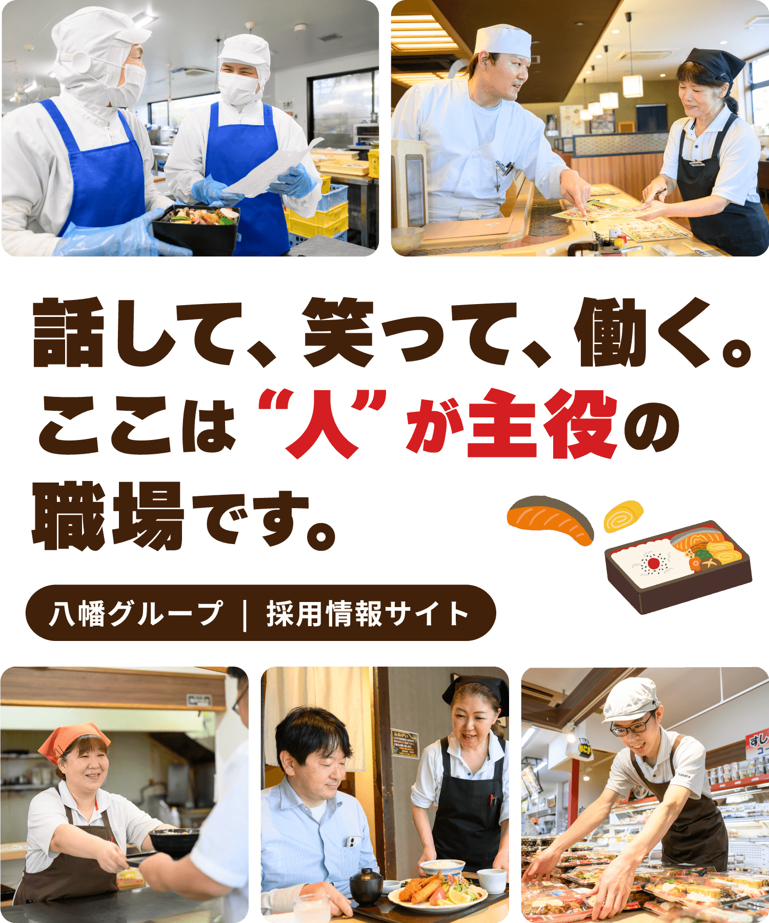 「味のやはた」は、地域の行事、企業イベントなど、個人から団体のお客様まで幅広く対応し、“体にやさしい美味しさ”をテーマに、寿司・弁当・惣菜の製造を行っています。